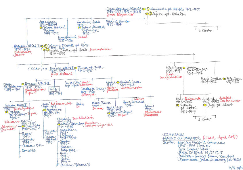 Stammbaum (Stand: April 2017) Die Familie Schumacher: Erläuterungen zum Stammbaum Die Fritz-Schumacher-Gesellschaft hat vor einiger Zeit aus unterschiedlichen Quellen, insbesondere dem Staatsarchiv Bremen, eine Reihe von Unterlagen erhalten, aus denen die verwandtschaftlichen Verbindungen von Fritz Schumacher ersichtlich sind. Aus diesen Einzelinformationen haben wir das Konzept für einen Stammbaum der Familie Schumacher entwickelt. Die folgenden Ausführungen…