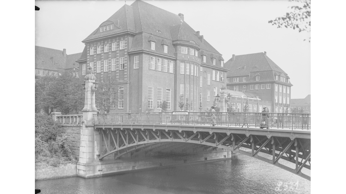 Schumachers bereits in Dresden begonnener Entwurf für die Staatliche Kunstgewerbeschule entstand auf der Grundlage eines von Bauinspektor Albert Erbe im Januar 1908 signierten Entwurfes, in dem die Massenverteilung des später errichteten Komplexes vorweggenommen ist. Die von Schumacher in herausgehobenener Lage an einer Wasserfront (Kuhmühlenteich) platzierte, von weither sichtbare Baugruppe in dunklem Backstein mit Ihren hohen Mannsarddächern sollte sich von den übrigen Schulbauten des Hamburger Staates ausdrücklich durch ein „abweichendes, mehr festliches Gepräge“ abheben. Den Kern bildet eine hufeisenförmige Anlage am Lerchenfeld mit vorgelagertem, durch einen Säulengang von der Straße abgetrennten „Zierhof“, den man durch eine kleinen ovalen Pavillon betritt. Von dort gelangt man in den gelegenen Hauptbau und die hohe Eingangshalle von feierlich-strenger Wirkung, in der ein in Schumachers frühen Villenbauten entwickelter Raumtyp in gesteigerter Form wiederkehrt: eine rechteckige hohe Dielenhalle, die ihr Licht von einer ebenso hohen Fenstergruppe an der Schmalseite erhält. In der zweigeschossigen Halle mit offener Treppenanlage an der Seite ist „das Gerippe der Eisenbetonbauweise“ bewußt sichtbar gelassen, mit an den Obrflächen scharrierten Betonteilen. Die Anordnung der Baukörper auf dem winkelförmigen Grundstück wurde mit ihren Funktionen begründet: Die Lage und Länge des Hufeisenbaus zum Beispiel ermöglichte die Unterbringung vieler Ateliers auf der sonnenabgewandten Rückseite . Die Absonderung des östlich anschließenden Werkstättenflügels hatte den Zweck, die Ateliers und Klassen von Maschinenlärm und Erschütterungen abzuschirmen. Die Forderungen der seit 1900 aktiven Bewegung zur Reform der Kunstschulen bezogen sich vor allem auf einen handwerksnahen praktischen Unterricht. Die Ausstattung des Neubaus am Lerchenfald mit Werkstätten aller Art (Buchdruckerei, Bildhauerwerkstatt, Atelier für Photographie, Goldschmiede, Töpferei, Handweberei, Tischlerei und andere) galt 1913 als vorbildlich und machte Hamburg damals zu einem bedeutenden Stützpunkt der Reform. An der künstlerischen Ausstattung beteiligten sich die Lehrer der Schule. Richard Luksch schuf die großen Keramikreliefs seitlich des Eingangspavillons, eine Mutter-Kind-Gruppe im Schmuckhof, das Relief über dem Vortragssaal und zwei dekorative Tierfiguren in Steinzeug am Verbindungstrakt. Die grau glasierten Steinzeugplastiken und die Baukeramik waren eine Gemeinschaftsarbeit der Luksch-Klasse. Von Johann Michael Bossard stammten drei figürliche Reliefs für die Rückseite des Schmuckhofs. Willi Titze fertigte das Deckenmosaik des Pavillons, Friedrich Adler den bekrönenden Zapfen. Das Innere wird bestimmt Carl Otto Czeschkas Jugenstilfenster in der Halle und Willy von Beckeraths Wandbildern im Versammlungsraum. Der Bau wurde nach Teilzerstörung im Zweiten Weltkrieg wiederhergestellt, wobei der westliche Flügel des Hufeisenbaus statt des Mansarddaches ein flaches Staffelgeschoß erhielt. Der völlig erhaltene Eingang mit Zierhof wurde im Sinne einer „Entmonumentalisierung“ in den 1950er Jahren entfernt. Die 1993 an dieser Stelle errichtete Freitreppe mit Arkade aus Beton und Stahl erinnert im Grundriss an die alte Situation (Entwurf: Bernhard Winking).
