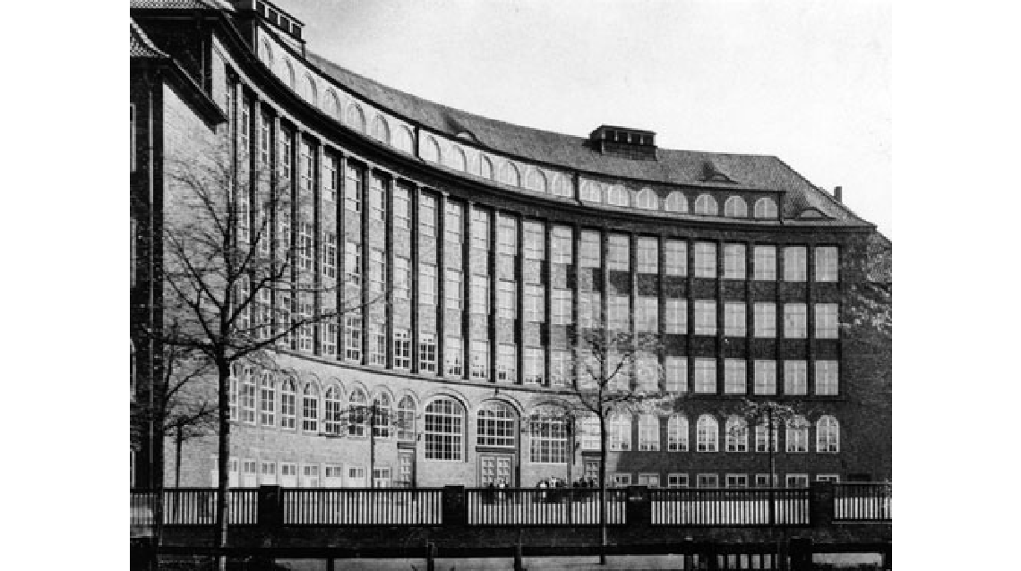 Die schon vor dem Ersten Weltkrieg entworfene Schule wurde bald nach dessen Ende auf der südwestlichen Ecke der geplanten Großsiedlung am Dulsberg gebaut. Schumacher legte das in Klinkern ausgeführte Schulgebäude als abschirmenden Riegel zwischen die Siedlung und den in den Winkel zweier Hauptstraßen gelegten Schulhof. Besonders auffällig ist der gleichmäßige }>große Zug der konkaven Rundung« (Schumacher: Selbstgespräche, S. 102), mit dem der fünfgeschossige Walmdach bau den Hof umschließt. Eine vertikale Ordnung aus kannelierten Backsteinhalbsäulen faßt die oberen drei Geschosse straff zusammen. Aula und Turnhalle befinden sich übereinander in einem querliegenden Anbau in der Mittelachse der Rückfront. Der Bautyp entspricht damit weitgehend der Volksschule am Rübenkamp (1911-12), die Schumacher vor dem Weltkrieg auf ein ähnliches Grundstück baute. Den Unterschied bildet die monumentalisierte Fassade, die zunächst auf lebhafte Bedenken stieß und die Genehmigung des Entwurfs durch die Bürgerschaft gefährdete (Schumacher, Selbstgespräche, ebd. ). Schumacher selbst sah seinen Bau, trotz der bereits vor 1914 gefundenen Form, als Auftakt einer „neuen Gesinnung, die sich nach dem Kriege für das Thema „Volksschule“ durchsetzte. Man erkannte, daß die Volksschule ein Hauptinstrument war, um das Niveau eines geschlagenen und bedrückten Volkes aufrechtzuerhalten. Die kommende Generation mußte gepflegt werden.“ (Schumacher: Selbstgespräche, ebd.)