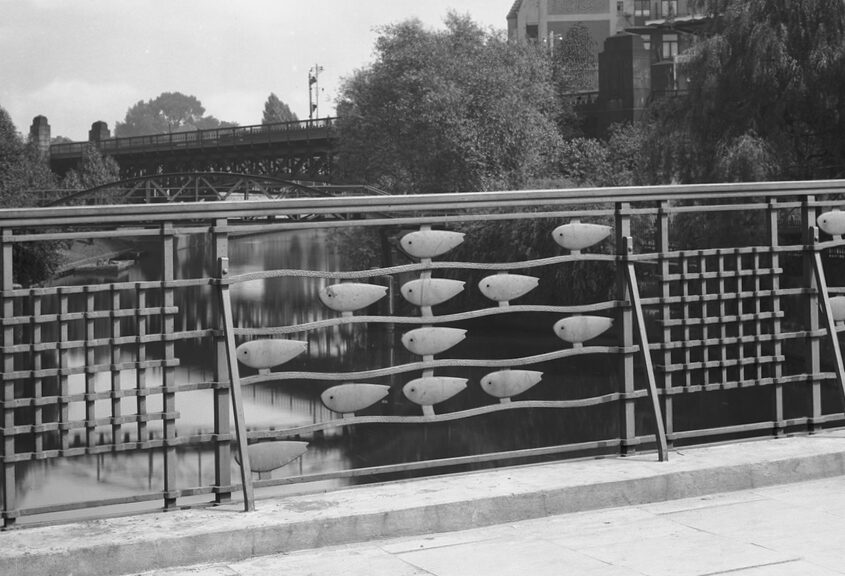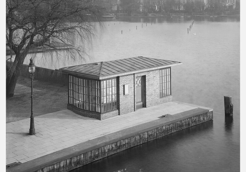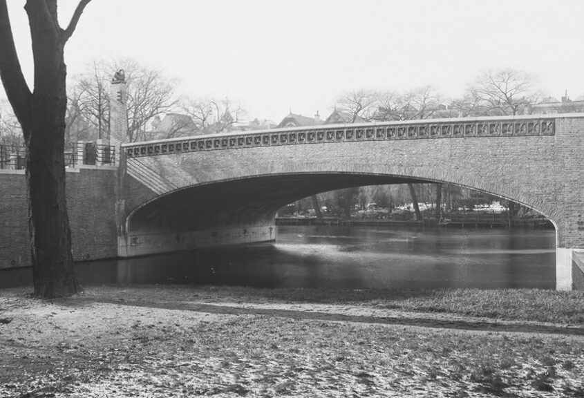 Etwa 100 Meter in Verlängerung der Krugkoppelbrücke überspannt die Fernsichtbrücke den Rondeelkanal. Die einteilige Bogenbrücke ist ähnlich wie die Krugkoppelbrücke gestaltet. Auch die Keramikeinsätze im Brüstungsmauerwerk sind von Richard Kuöhl und zeigen das gleiche Motiv. Die Brücke liegt auf einem Sockel aus Granit. Abbildung: cc-by-4.0 Staats- und Universitätsbibliothek Hamburg Carl von Ossietzky >> link zu…