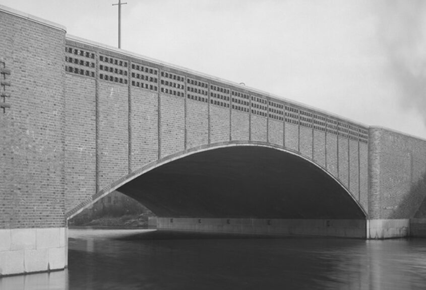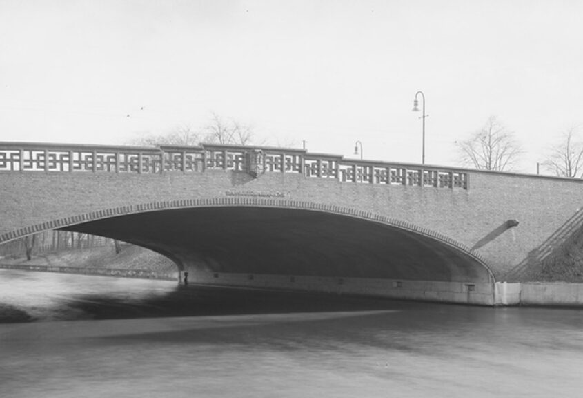 Die Bogenbrücke aus Stahlbeton überspannt den Goldbekkanal an der Einmündung in den Rondeelkanal. Die Seiten der Brücke sind mit Klinkern verblendet, die Unterseite ist in Sichtbeton. Die Brüstungsmauer wird durch ein Band quadratischer Keramikmotive durchbrochen, und an der Brückenauffahrt sitzt auf einem hohen, freistehenden Mauerpfeiler ein bronzener Schwan. Abbildung: cc-by-4.0 Staats- und Universitätsbibliothek Hamburg Carl…