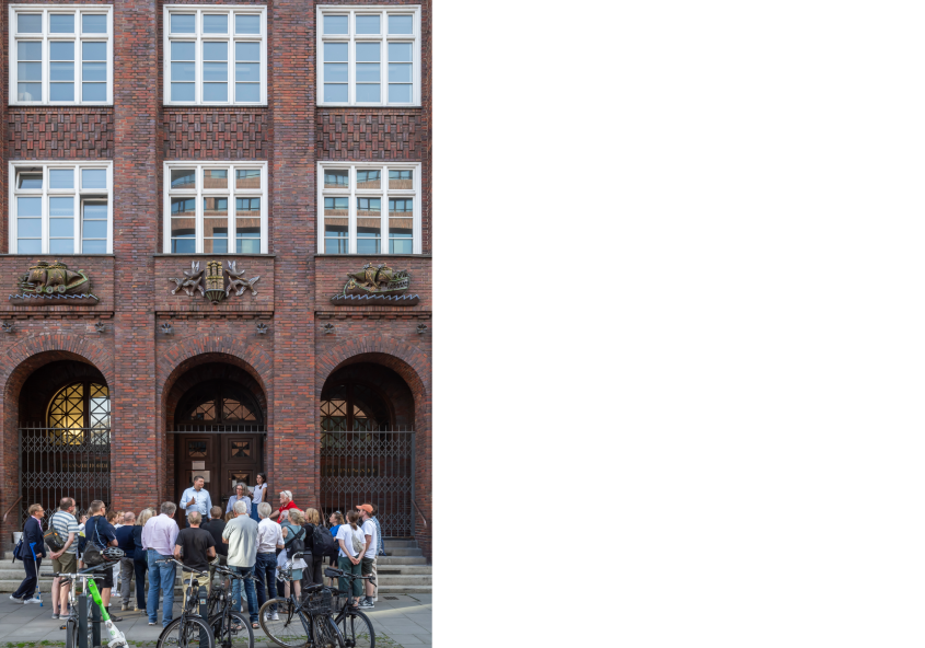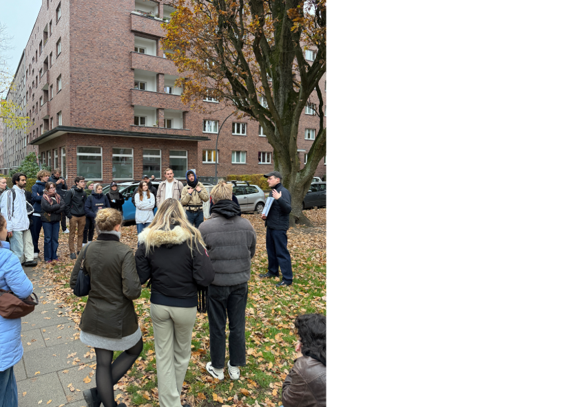Bei einem gemeinsamen Rundgang durch die Jarrestadt mit Architektur-Studierenden des Studios Kempe Thill der Leibniz Universität Hannover erläutert Jonas Trittmann vor Ort die städtebaulichen Ideen Schumachers für diese ab Mitte der 1920er Jahren entstandene Siedlung. -