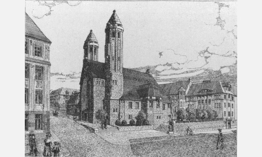 1903 veröffentlichte Schumacher eine Skizze und zwei Grundrisse für das Projekt einer Kirche einer freireligiösen Gemeinde in der Architektonischen Rundschau. „Im Äusseren ist versucht, dem Bauwerk trotz verhältnismässig bescheidener Dimension einen monumentalen Charakter zu geben, dadurch, dass aller Effekt auf einen massigen Turmbau konzentriert ist. Der Aufbau des Turmes bleibt bis oben in Stein; er…