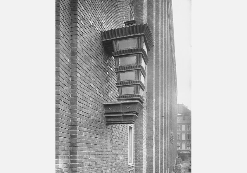dahinterliegenden Eisenbetonskeletts und beliebig addierbaren nichttragenden Wänden. Der mit bräunlichen Klinkern verkleidete Bau erhielt eine regelmäßige Pfeilergliederung, deren Vertikalismus in der oberen Zone von drei zurückspringenden Geschossen ausgeglichen wird. Die abschließende Wirkung wird durch die oben angeordneten Bogenfenster noch verstärkt. An der stumpfen Ecke zwischen Gänsemarkt und Valentinskamp – sie bildet den Fluchtpunkt der Dammtorstraße – ist eine Rundung…